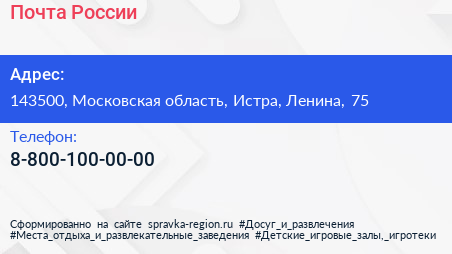 Почта России по адресу 143500, Московская область, Истра, Ленина, 75 в дальнейшем Организация, размещена в следующих категориях: