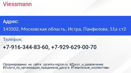 Viessmann по адресу 143502, Московская область, Истра, Панфилова, 51а ст2 в дальнейшем Организация, размещена в следующих категориях: