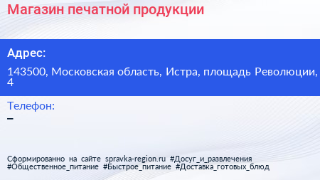 Магазин печатной продукции по адресу 143500, Московская область, Истра, площадь Революции, 4 в дальнейшем Организация, размещена в следующих категориях: