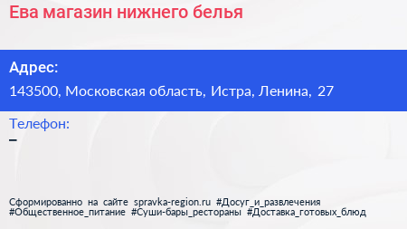 Ева, магазин нижнего белья по адресу 143500, Московская область, Истра, Ленина, 27 в дальнейшем Организация, размещена в следующих категориях: