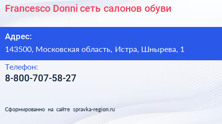 Francesco Donni, сеть салонов обуви по адресу 143500, Московская область, Истра, Шнырева, 1 в дальнейшем Организация, размещена в следующих категориях:
