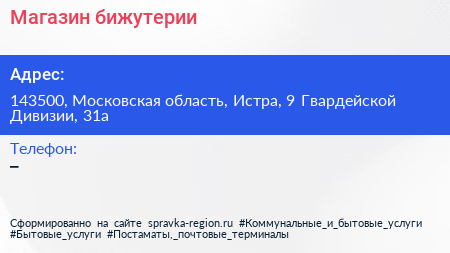 Магазин бижутерии по адресу 143500, Московская область, Истра, 9 Гвардейской Дивизии, 31а в дальнейшем Организация, размещена в следующих категориях: