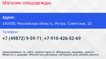 Магазин спецодежды по адресу 143500, Московская область, Истра, Советская, 22 в дальнейшем Организация, размещена в следующих категориях: