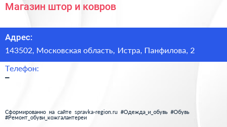 Магазин штор и ковров по адресу 143502, Московская область, Истра, Панфилова, 2 в дальнейшем Организация, размещена в следующих категориях: