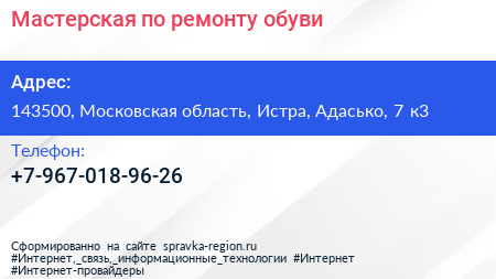 Мастерская по ремонту обуви по адресу 143500, Московская область, Истра, Адасько, 7 к3 в дальнейшем Организация, размещена в следующих категориях: