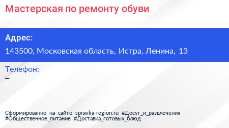 Мастерская по ремонту обуви по адресу 143500, Московская область, Истра, Ленина, 13 в дальнейшем Организация, размещена в следующих категориях: