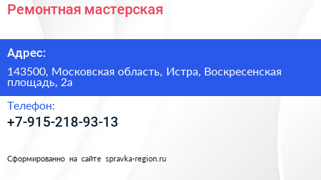 Ремонтная мастерская по адресу 143500, Московская область, Истра, Воскресенская площадь, 2а в дальнейшем Организация, размещена в следующих категориях: