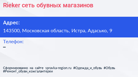 Rieker, сеть обувных магазинов по адресу 143500, Московская область, Истра, Адасько, 9 в дальнейшем Организация, размещена в следующих категориях: