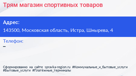 Трям, магазин спортивных товаров по адресу 143500, Московская область, Истра, Шнырева, 4 в дальнейшем Организация, размещена в следующих категориях: