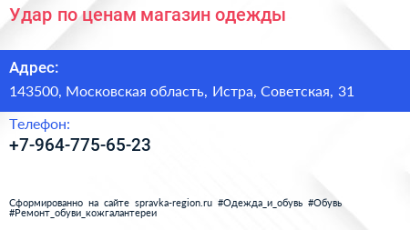 Удар по ценам, магазин одежды по адресу 143500, Московская область, Истра, Советская, 31 в дальнейшем Организация, размещена в следующих категориях: