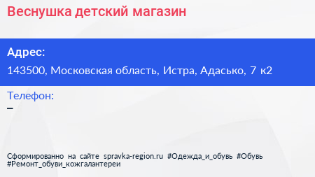 Веснушка, детский магазин по адресу 143500, Московская область, Истра, Адасько, 7 к2 в дальнейшем Организация, размещена в следующих категориях: