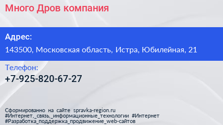 Много-Дров, компания по адресу 143500, Московская область, Истра, Юбилейная, 21 в дальнейшем Организация, размещена в следующих категориях: