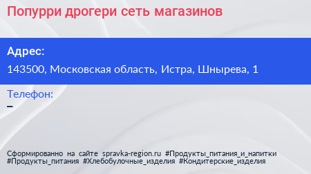 Попурри дрогери, сеть магазинов по адресу 143500, Московская область, Истра, Шнырева, 1 в дальнейшем Организация, размещена в следующих категориях: