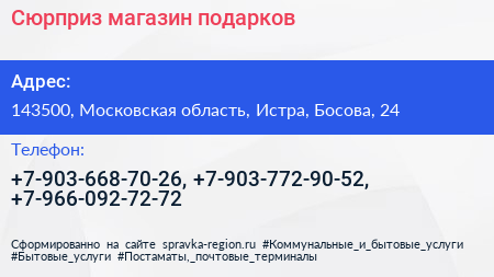 Сюрприз, магазин подарков по адресу 143500, Московская область, Истра, Босова, 24 в дальнейшем Организация, размещена в следующих категориях: