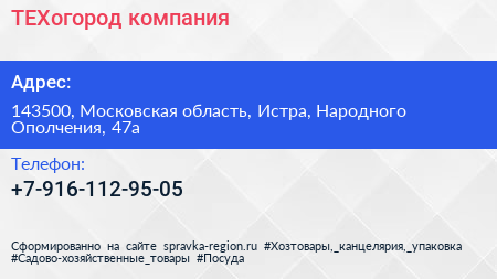 ТЕХогород, компания по адресу 143500, Московская область, Истра, Народного Ополчения, 47а в дальнейшем Организация, размещена в следующих категориях: