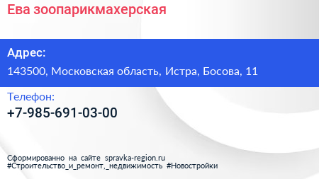 Ева, зоопарикмахерская по адресу 143500, Московская область, Истра, Босова, 11 в дальнейшем Организация, размещена в следующих категориях: