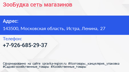 ЗооБудка, сеть магазинов по адресу 143500, Московская область, Истра, Ленина, 27 в дальнейшем Организация, размещена в следующих категориях: