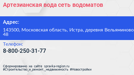 Артезианская вода, сеть водоматов по адресу 143500, Московская область, Истра, деревня Вельяминово, 48 в дальнейшем Организация, размещена в следующих категориях: