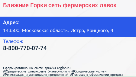 Ближние Горки, сеть фермерских лавок по адресу 143500, Московская область, Истра, Урицкого, 4 в дальнейшем Организация, размещена в следующих категориях: