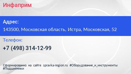 Инфаприм по адресу 143500, Московская область, Истра, Московская, 52 в дальнейшем Организация, размещена в следующих категориях: