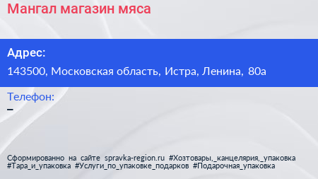 Мангал, магазин мяса по адресу 143500, Московская область, Истра, Ленина, 80а в дальнейшем Организация, размещена в следующих категориях: