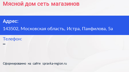 Мясной дом, сеть магазинов по адресу 143502, Московская область, Истра, Панфилова, 5а в дальнейшем Организация, размещена в следующих категориях: