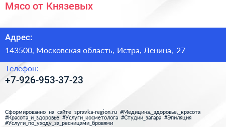 Мясо от Князевых по адресу 143500, Московская область, Истра, Ленина, 27 в дальнейшем Организация, размещена в следующих категориях:
