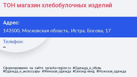 ТОН, магазин хлебобулочных изделий по адресу 143500, Московская область, Истра, Босова, 17 в дальнейшем Организация, размещена в следующих категориях: