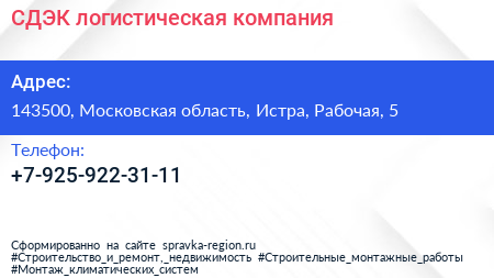 СДЭК, логистическая компания по адресу 143500, Московская область, Истра, Рабочая, 5 в дальнейшем Организация, размещена в следующих категориях: