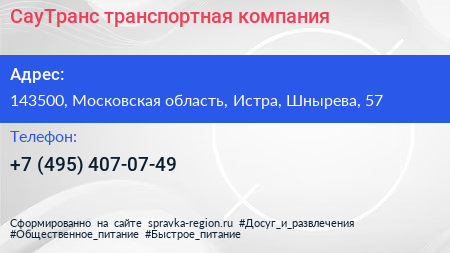 СауТранс, транспортная компания по адресу 143500, Московская область, Истра, Шнырева, 57 в дальнейшем Организация, размещена в следующих категориях: