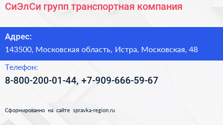 СиЭлСи групп, транспортная компания по адресу 143500, Московская область, Истра, Московская, 48 в дальнейшем Организация, размещена в следующих категориях: