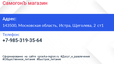 СамогонЪ, магазин по адресу 143500, Московская область, Истра, Щеголева, 2 ст1 в дальнейшем Организация, размещена в следующих категориях: