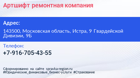 Артшифт, ремонтная компания по адресу 143500, Московская область, Истра, 9 Гвардейской Дивизии, 9Б в дальнейшем Организация, размещена в следующих категориях: