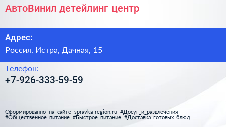 АвтоВинил, детейлинг-центр по адресу 15А, Центральная кольцевая автомобильная дорога, Ивановское, Агрогородок, городской округ Истра, Московская область, Центральный федеральный округ, 143511, Россия в дальнейшем Организация, размещена в следующих категориях: