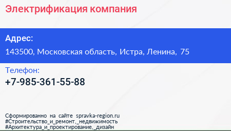 Электрификация, компания по адресу 143500, Московская область, Истра, Ленина, 75 в дальнейшем Организация, размещена в следующих категориях:
