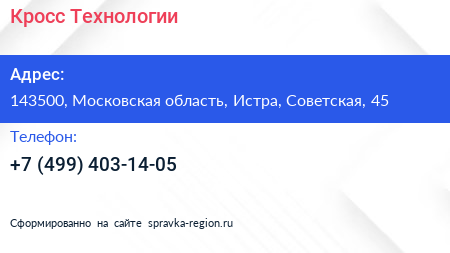 Кросс Технологии по адресу 143500, Московская область, Истра, Советская, 45 в дальнейшем Организация, размещена в следующих категориях: