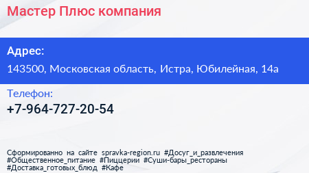 Мастер Плюс, компания по адресу 143500, Московская область, Истра, Юбилейная, 14а в дальнейшем Организация, размещена в следующих категориях: