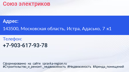 Союз электриков по адресу 143500, Московская область, Истра, Адасько, 7 к1 в дальнейшем Организация, размещена в следующих категориях: