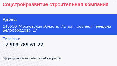 Соцстройразвитие, строительная компания по адресу 143500, Московская область, Истра, проспект Генерала Белобородова, 17 в дальнейшем Организация, размещена в следующих категориях: