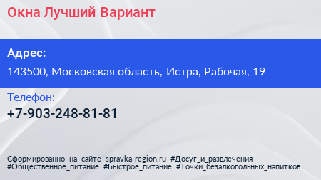 Окна Лучший Вариант по адресу 143500, Московская область, Истра, Рабочая, 19 в дальнейшем Организация, размещена в следующих категориях: