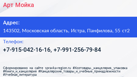 Арт Мойка по адресу 143502, Московская область, Истра, Панфилова, 55 ст2 в дальнейшем Организация, размещена в следующих категориях: