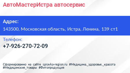 АвтоМастерИстра, автосервис по адресу 143500, Московская область, Истра, Ленина, 139 ст1 в дальнейшем Организация, размещена в следующих категориях: