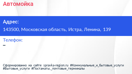 Автомойка по адресу 143500, Московская область, Истра, Ленина, 139 в дальнейшем Организация, размещена в следующих категориях: