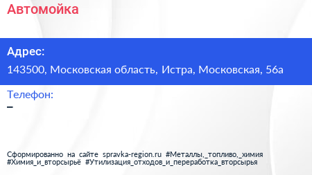 Автомойка по адресу 143500, Московская область, Истра, Московская, 56а в дальнейшем Организация, размещена в следующих категориях: