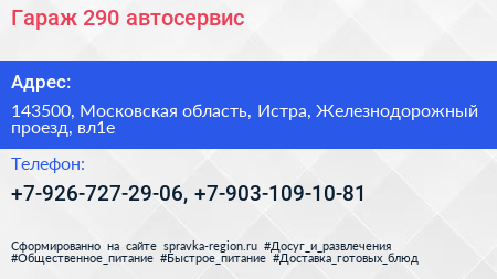 Гараж 290, автосервис по адресу 143500, Московская область, Истра, Железнодорожный проезд, вл1е в дальнейшем Организация, размещена в следующих категориях: