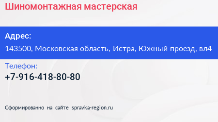 Шиномонтажная мастерская по адресу 143500, Московская область, Истра, Южный проезд, вл4 в дальнейшем Организация, размещена в следующих категориях: