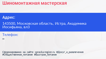 Шиномонтажная мастерская по адресу 143500, Московская область, Истра, Академика Иосифьяна, вл3 в дальнейшем Организация, размещена в следующих категориях: