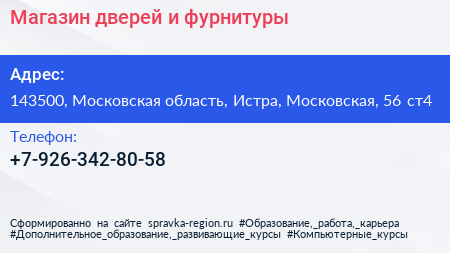 Магазин дверей и фурнитуры по адресу 143500, Московская область, Истра, Московская, 56 ст4 в дальнейшем Организация, размещена в следующих категориях: