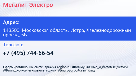 Мегалит-Электро по адресу 143500, Московская область, Истра, Железнодорожный проезд, 5Б в дальнейшем Организация, размещена в следующих категориях: