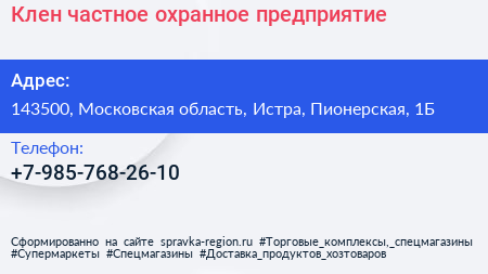 Клен, частное охранное предприятие по адресу 143500, Московская область, Истра, Пионерская, 1Б в дальнейшем Организация, размещена в следующих категориях: